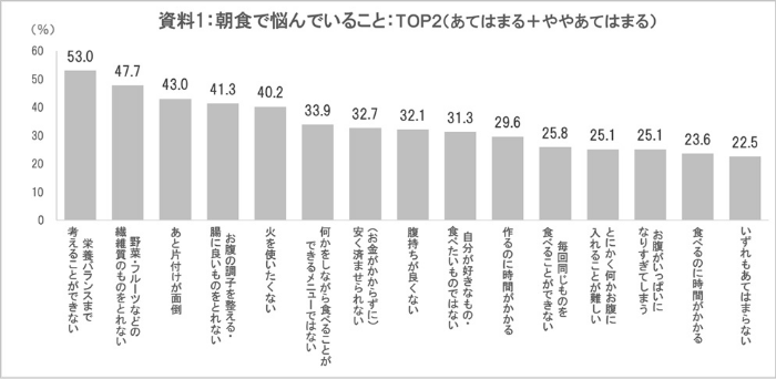 「朝食で悩んでいること」は、14項目中多い順に「栄養バランスまで考えられない」53.0%、「野菜・フルーツなどの繊維質のものをとれない」47.7%、「あと片付けが面倒」43.0%、「お腹の調子を整える・腸に良いものをとれない」41.3%、「火を使いたくない」40.2%が上位5項目となり、栄養面と準備・あと片付けの手間に多くの人が悩んでいることが分かりました。(資料1)