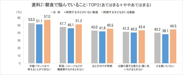 また子どもがいる家庭といない家庭とを比較すると、朝食の悩みの上位の項目がより高くなることが分かりました。(資料2)