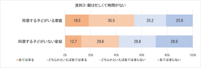日常生活について、「朝は忙しくて時間がない」と感じる人が、子どもがいる家庭では、いない家庭と比較して、「あてはまる」、「どちらかというとあてはまる」の回答が11.7ポイント高くなりました。(資料3)