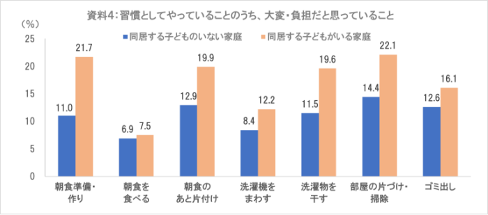同居する子どものいる家庭では、「朝は忙しくて時間がない」と感じており、「朝食の準備」や「あと片付け」も、より負担に感じる傾向に