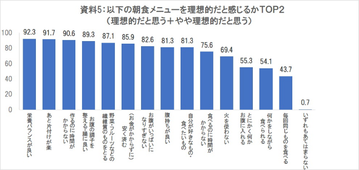 「理想の朝食」については、「栄養バランスが良い」92.3%、「あと片付けが楽」91.7%、「作るのに時間がかからない」90.6%、「お腹の調子を整える・腸に良い」89.3%、「野菜・フルーツなどの繊維質のものをとる」87.1%となり、「朝食の悩み」と「理想の朝食」は、表裏一体の関係であることが分かりました。(資料5)