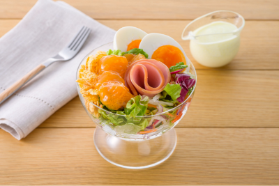 ①5割以上が悩む栄養バランスを解決!『ハムとゆで卵のサラダパフェ ヨーグルトソース添え』
