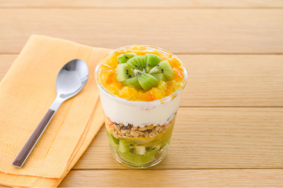 ビタミンCが豊富なキウイフルーツに、レモンやオレンジの爽やかなジャムを合わせて、朝もスッキリ頑張れそうな朝パフェです。ヨーグルトに混ぜたクリームチーズと「55 レモンママレード」がマッチした一品です。「まるごと果実 オレンジ」を使うことで手軽に果肉感を楽しむことができ、色合いも華やかになります。
