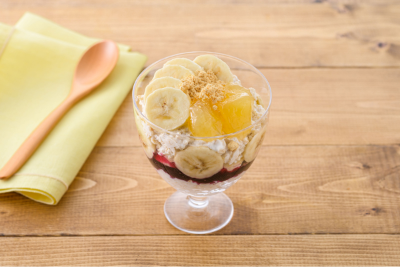 ④おなかに優しく!『バナナときな粉とオートミールのパフェ』