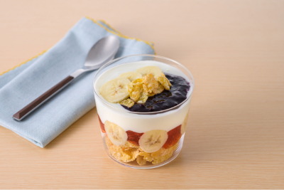バナナやヨーグルト、コーンフレークを使用した時間がない朝でも手軽に作れるレシピです。ジャムの爽やかな酸味や甘みがバナナ、ヨーグルトとマッチして飽きのこないおいしさです。片手で使えるボトル容器「Spoon Free」を使えば、手軽に味の変化を楽しめます。