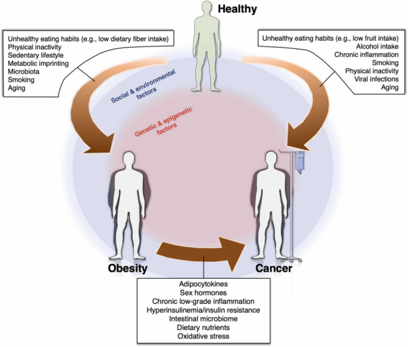 これまでの研究で、健康な人ががんを発症する要因として、食事の質やパターンなどの生活習慣が密接に関係していることが分かっています。さらにそれらは、がんのリスクを高める「肥満」の要因ともなり得ることから、がん発症のリスク要因をさらに増やすことにもつながります(下図参照)。