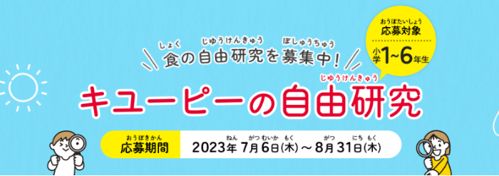 キユーピー株式会社(本社:東京都渋谷区、代表取締役 社長執行役員:髙宮 満、以下キユーピー)は、キユーピー公式サイト内の食育コンテンツ『食生活アカデミー』で7月6日(木)から食に関する自由研究の募集を開始します。今年は新たに、自由研究の進め方をサポートする「自由研究お助けガイド」を制作し募集開始と同時に公開します。