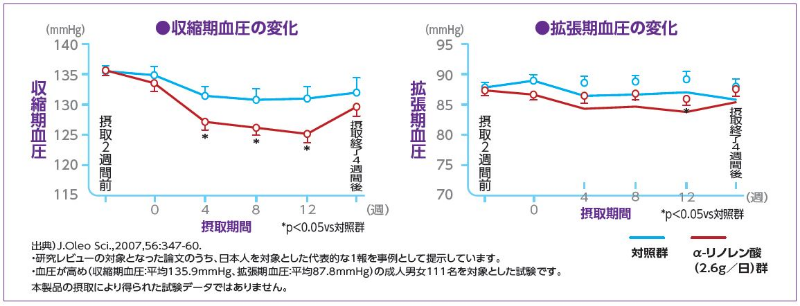 ※3 臨床試験では、血圧が高めの方※1がα-リノレン酸を1日あたり2.6g摂取すると血圧が正常値まで低下したという結果が得られています。(J. Oleo Sci., 2007, 56:347-60.)