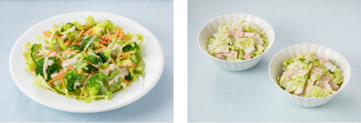 【調理例】㊧ブロッコリーとにんじんのグリーンサラダ、㊨白菜とハムのあえサラダ