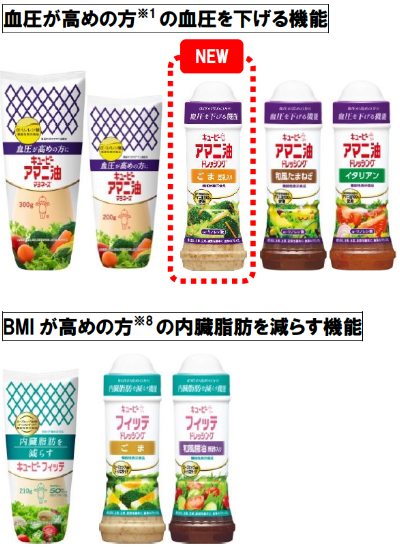 機能性表示食品の「アマニ油ドレッシング」「フィッテドレッシング」は、今春、マヨネーズ類の機能性表示食品とシリーズやパッケージデザインを統一しました※2。商品の機能や価値が伝わりやすくなり、アマニ油ドレッシングの売上は前年比135%と好調です(2023年4月~5月の出荷実績)。今回、人気の乳化系ごまドレッシングが加わることで、お客さまの満足度向上と市場へのさらなる定着を図ります。