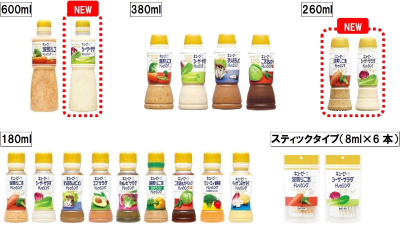 キユーピー株式会社(本社:東京都渋谷区、代表取締役 社長執行役員:髙宮 満、以下キユーピー)は、ドレッシングの主力商品「深煎りごまドレッシング」と「シーザーサラダドレッシング」の容量ラインアップを拡充します。「深煎りごまドレッシング」に260ml、「シーザーサラダドレッシング」に260mlと600mlの新容量を追加し、それぞれ5つの容量ラインアップで展開します。