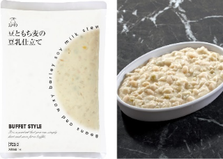 白いんげん豆と野菜のうま味に濃厚な豆乳が調和した味わいです。豆乳ベースのホワイトソースにマローファットピースのやさしい緑色がアクセントです。注目素材のもち麦とたかきびを配合し、健康感のある仕立てにしました。