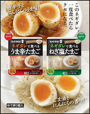 そこで、キユーピーグループ独自の技術を活用し、開封してすぐに食べられる商品を開発しました。ラインアップは、唐辛子とにんにくのうま味がきいた「うま辛たまご」と、ごま油とにんにくの香りが食欲をそそる「ねぎ塩たまご」の2品です。賞味期間が冷蔵で45日間あるため、冷蔵庫にストックしておくこともできます。