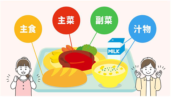 - 献立は「主食・主菜・副菜・汁物」をそろえるのがコツ