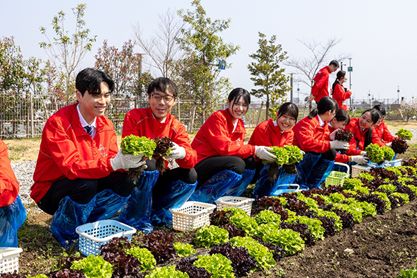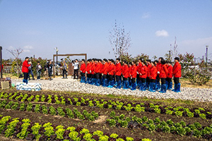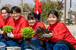 式典の後、新入社員は畑で“未来への種まき”としてゴマの種をまき、食べ頃に育ったリーフレタスを収穫しました。