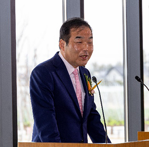 式典では、代表取締役 社長執行役員 髙宮が、「普段から従業員のみなさんにはどんどん挑戦しよう、と伝えている。そのような中で、ある若手社員が“記憶に残る入社式がしたい”と企画した。」と今回の入社式の背景を述べました。そして、「働く上で大切なのは、“自己実現”と“期待役割”。これが一致したときに仕事の価値が上がる。会社はみなさんの自己実現を全力で応援する。」と熱いエールを送りました。