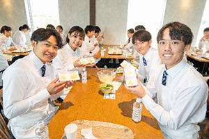 その後は、先輩社員の指導を受けながらマヨネーズ作りに挑戦です。昼食では、畑に併設したレストランで、自分たちで収穫したリーフレタスを使ったサラダを食べました。