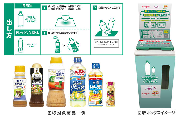 キユーピー株式会社(本社:東京都渋谷区、代表取締役 社長執行役員:髙宮 満、以下キユーピー)と日清オイリオグループ株式会社(本社:東京都中央区、代表取締役社長:久野 貴久、以下日清オイリオグループ)は、ドレッシングや食用油の油が付着したPETボトルの資源循環に向けて、イオン株式会社(本社:千葉県千葉市、代表執行役社長:吉田 昭夫)に協力いただき、千葉市内の「イオン」「イオンスタイル」8店舗にて、5月29日(水)から使用済み油付きPETボトルの回収を開始します。