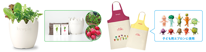 | プレゼント賞品 | Aコース「収穫体験キット&オリジナルレシピブック」 2,000名様 たまご型プランター、土4L、野菜2品種の種子(ベビーリーフレタスミックス/ラディッシュ)にレシピブックが付いた収穫体験キットです。レシピブックは収穫した野菜が楽しめるレシピを紹介しています。 Bコース「親子エプロン&オリジナルレシピブック」 1,000名様 親子エプロン(大人用1枚、子ども用1枚)とキユーピーとヤサイな仲間たちのワッペン(10種)にレシピブックが付いた、親子で一緒に料理が楽しめるセットです。 |