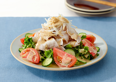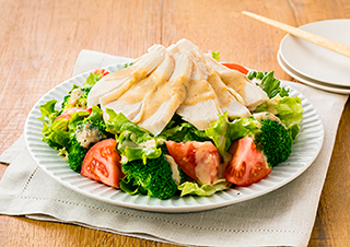メニュー例: 「ブロッコリーとトマトと鶏むね肉のサラダ」(深煎りごまドレッシング カロリーハーフ使用)