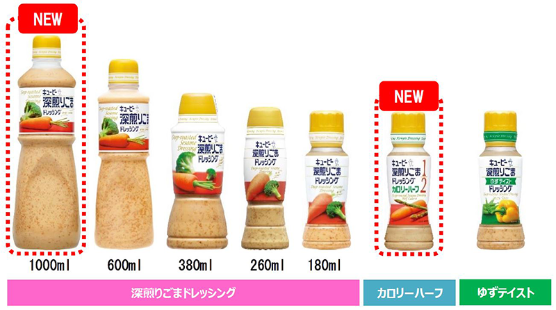 昨年には、あらゆる世帯や使用場面にフィットする容量ラインアップを目指し、ボリュームゾーンである中容量帯(150~399ml)で260mlの新容量も発売しました※3。今回新たに1000mlが加わることで、深煎りごまドレッシングは5つの容量展開(180ml、260ml、380ml、600ml、1000ml)に拡大します。