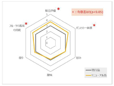 ▲ロールパンと一緒に食べた際の官能評価(現行品とリニューアル品の比較)
