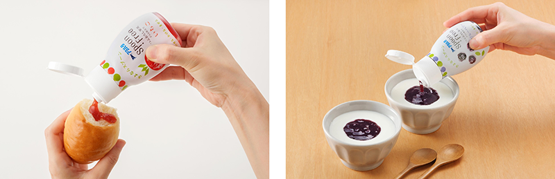 - スプーンを使わずさっと使える、甘さ控えめで果実感のある、ボトル容器入りのフルーツスプレッドです。