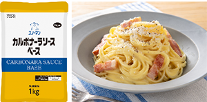 | 【商品特徴】 チーズの風味とたまごの風味、そして甘みのバランスが取れた味わいです。ベースソースとしてさまざまな料理にアレンジでき、スパゲティカルボナーラをはじめとするパスタ料理や、その他の創作料理にも幅広く活用できます。また、加熱してもなめらかさが変わらないため、調理後もおいしさが持続します。 写真:㊧「カルボナーラソースベース AR」、㊨スパゲティカルボナーラ |