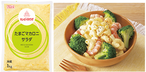 | 【商品特徴】 ごろごろとしたたまごとエルボマカロニをマヨネーズで和えた、具材感のあるマカロニサラダです。そのままでも、焼成メニューにも使用可能で、多様な料理に取り入れることができます。 写真:㊧「たまごマカロニサラダ」、㊨えびとブロッコリーのたまごマカロニサラダ |