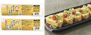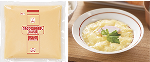 | 【商品特徴】 袋のままスチームコンベクションオーブンで加熱調理するだけで、なめらかなおぼろ状の茶碗蒸しが完成します。かつお節の風味がほどよくきいた上品な味わいと、口当たりの良い食感が特徴で、高齢者の方でも安心して召し上がっていただけます。また、食器に付着しにくいため、洗浄の手間も軽減されます。 写真:㊧「なめらか食感茶碗蒸し(おぼろ状)」、㊨おぼろ茶碗蒸し |