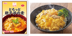 | 【商品特徴】 加熱しても固まらず、半熟卵のようなコクと食感を楽しめる親子丼の素です。独自製法により、卵黄のツヤを再現しています。鶏肉入りで、湯せんやレンジで加熱するだけで手軽に使用でき、忙しい調理現場でも便利です。 写真:㊧「とろっと親子丼の素」、㊨親子丼 |