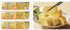| 【商品特徴】 焼津産かつお節だしと北海道利尻産昆布のだしの香りとうま味にこだわり、ふっくらジューシーな食感に仕上げたほどよい甘さのたまごやきです。 写真:㊧「料亭風たまごやき」3品、㊨たまごやき |