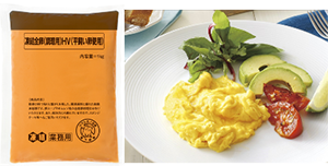 | 【商品特徴】 原料に平飼い卵を使用した、鶏卵の持つ粘りと繋がりを残した調理適性に優れた殺菌凍結卵です。卵スープやオムレツ等の各種卵料理が作れます。 写真:㊧「凍結全卵(調理用)HV(平飼い卵使用)」、㊨スクランブルエッグ |