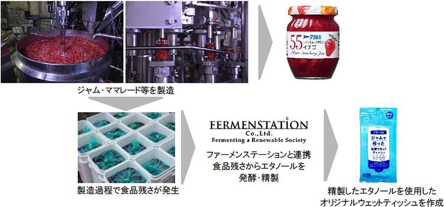 今回、独自の発酵技術で未利用資源を再生・循環させる社会を構築する研究開発型スタートアップの株式会社ファーメンステーション(本社:東京都墨田区、代表取締役:酒井里奈、以下ファーメンステーション)と連携し、製造過程で発生する食品残さを原料にアルコール(エタノール)の発酵・精製に成功しました。これを使用したオリジナルのウェットティッシュを作成し、株主優待品などに使用します。製造過程で発生する食品残さを日用品にアップサイクル※1した当社初の事例になります。
