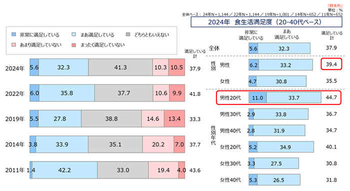 2011年の調査開始以降、食生活に「満足している」(「非常に満足している」と「まあ満足している」の合計)と回答した人の割合は、4割前後で横ばい傾向を示しています。年代別分析では、20代の満足度が高い傾向が顕著であり、特に20代男性は44.7%が満足していると回答しています。男女比較では、男性の満足度が39.4%で、女性より3.9ポイント高い結果となりました(資料1)。