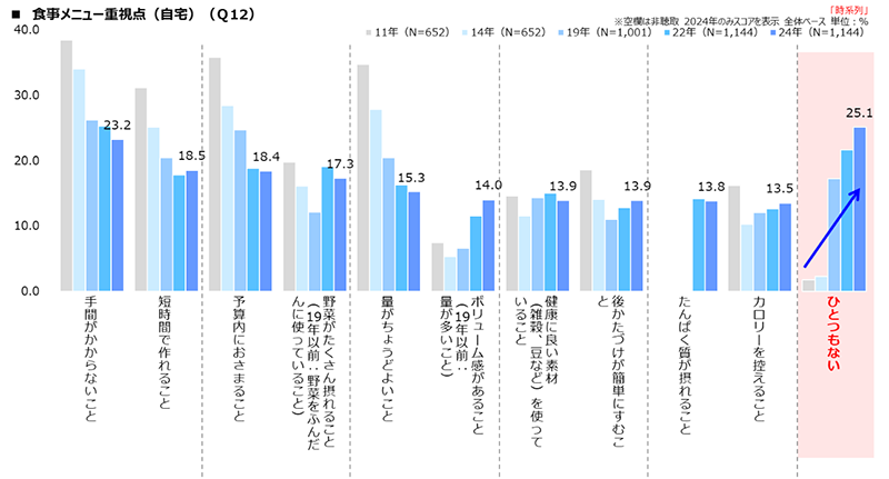これらの変化は、調理の簡便化や外部化の進行に加え、現代のライフスタイルの変化や時間効率を重視する傾向を反映していると考えられます。