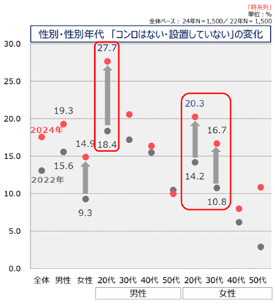 自宅にコンロ※2が設置してあるか尋ねた設問では、2022年と比べると、「コンロはない・設置していない」と回答した割合が全体的に増加傾向にあります。性別で見ると、男性より女性の方が高く、特に20代男性および20~30代女性で顕著な増加が見られました(資料5)。