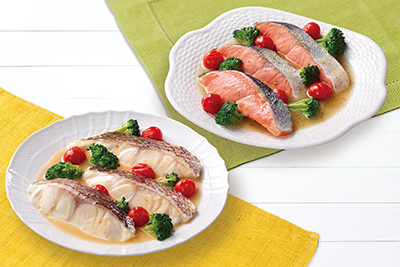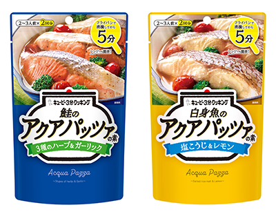 旬の魚に合わせて選んでいただけるように「鮭のアクアパッツァの素 3種のハーブ&ガーリック」と「白身魚のアクアパッツァの素 塩こうじ&レモン」の2種類のソースをラインアップしました。商品は2〜3人前が2袋入っており、フライパンでも電子レンジでも調理可能です。