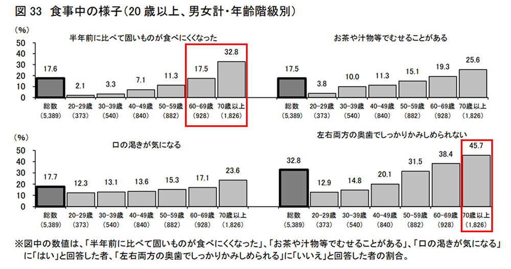 (https://www.mhlw.go.jp/content/10900000/001296359.pdf)の「第5章 歯・口腔の健康に関する状況」より、「図33 食事中の様子(20歳以上、男女計・年齢階級別)」に赤枠を追記