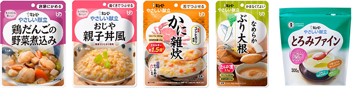 容易にかめる(6品)、歯ぐきでつぶせる(10品)、舌でつぶせる(11品)、かまなくてよい(21品)、とろみ調整(3品)