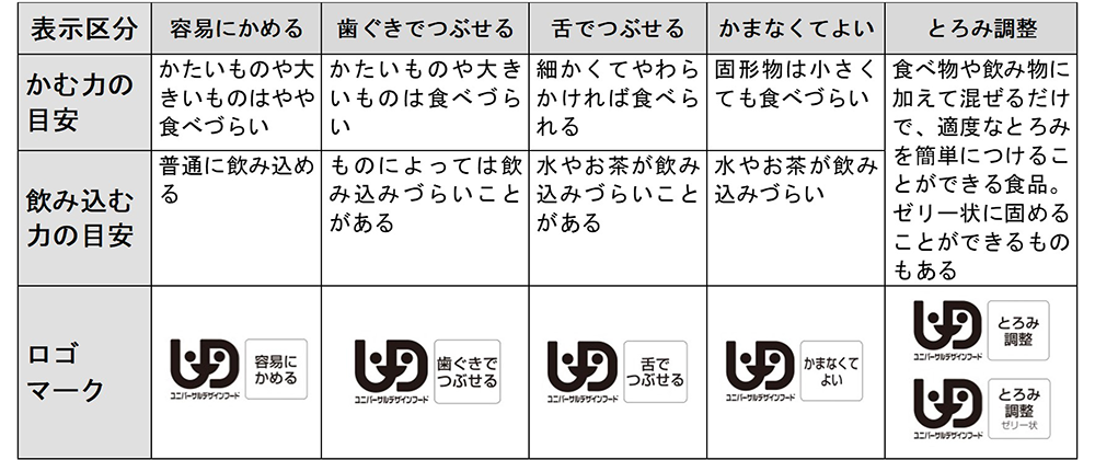 ※ 日本介護食品協議会が定めたユニバーサルデザインフード(UDF)の自主規格。かむ力や飲み込む力に応じた4区分(容易にかめる・歯ぐきでつぶせる・舌でつぶせる・かまなくてよい)と、とろみ調整で構成。