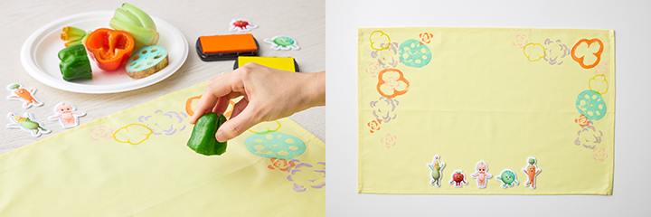 ランチクロスに、野菜スタンプや「キユーピーとヤサイな仲間たち」オリジナルワッペンを飾ってオリジナルランチクロスが作れます。(各日7回開催)