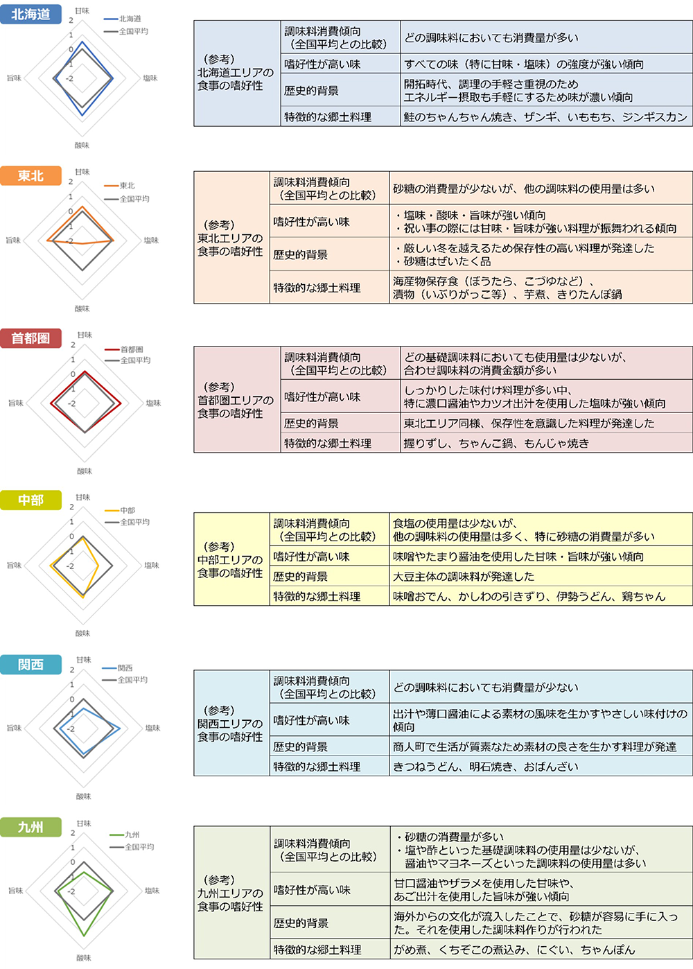 ①調味料消費量傾向、②①を基にした嗜好性が高い味(甘味:砂糖/塩味:食塩・醤油/旨味:味噌/酸味:酢・マヨネーズ・マヨネーズ風味調味料)、③歴史的背景、④特徴的な郷土料理