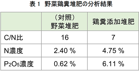 野菜堆肥に比べ、野菜鶏糞堆肥は窒素やリン酸の肥料成分が多く、炭素率(C/N比)が低いことが分かりました(表1)。