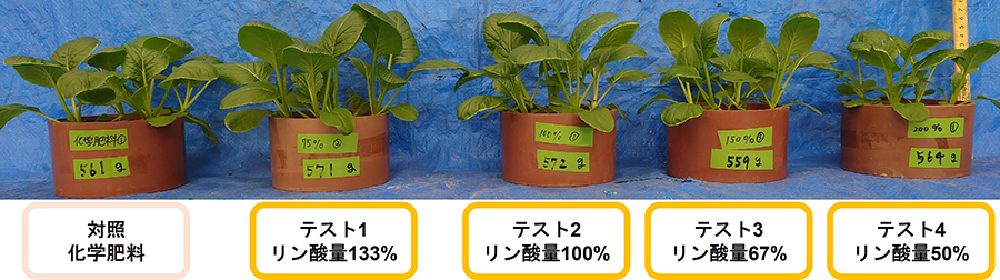 - コマツナの栽培において、野菜鶏糞堆肥は100%のリン酸肥効率※3を示し、化学肥料と同等の収量が得られました。