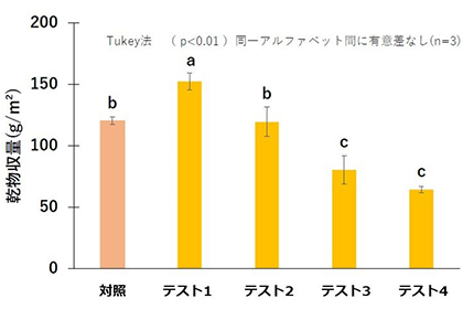 対照(化学肥料)とリン酸量が同じテスト2(リン酸量100%)の試験区で、化学肥料と同程度の収量が得られました(図1、グラフ1)。これより、野菜鶏糞堆肥のリン酸肥効率※3は100%であることが分かりました。