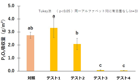 一方、リン酸の植物への吸収量はリン酸量を減らしたテスト3・テスト4で大きく低下することが分かりました(グラフ2)。追加試験で、野菜鶏糞堆肥と化学肥料を混合してコマツナを栽培したところ、計算上のリン酸肥効率が100%以上となることが分かりました(グラフなし)。野菜鶏糞堆肥が土壌へのリン酸吸着を抑制させていることに加えて、化学肥料由来のリン酸の利用率を向上させていると推察されます。
