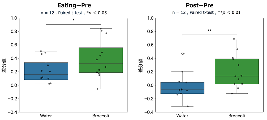 Mediationの値を正規化し、平均値を算出した。摂取前との差を、水(対照)とブロッコリーで比較した。