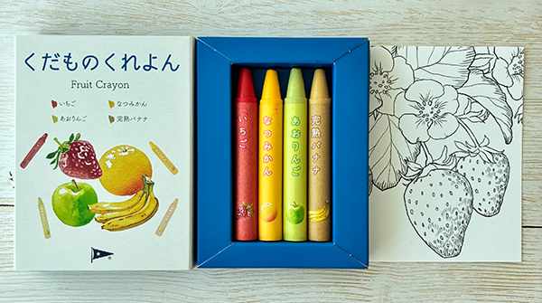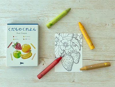 「くだものくれよん」の原料は全て天然由来の成分で、米ぬかから採れた米油とライスワックスをベースに、製造工程等で廃棄されるフルーツの一部を乾燥パウダーにしてクレヨンに混ぜています。原料となるフルーツの色を活かした4色(赤・黄・緑・茶)セットです。この4色を使うとイチゴが描けるようになっており、開封後すぐに楽しめるようイチゴの塗り絵を同封しました。自然の恵みに感謝し、フルーツを大切にしたいというアヲハタの想いが込められています。