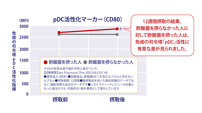 本品には、「酢酸菌GK-1(G.hansenii GK-1)」が含まれます。酢酸菌GK-1は、pDC(プラズマサイトイド樹状細胞)に働きかけ、健康な人の免疫機能の維持に役立つことが報告されています。